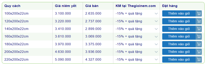 Nệm Vạn Thành 15cm giá bao nhiêu?