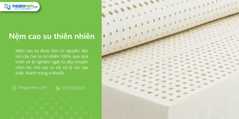 Cao su thiên nhiên là một chất liệu được sử dụng để sản xuất nhiều sản phẩm khác nhau, trong đó phổ biến nhất là sản xuất nệm. Nệm cao su được làm từ nguyên liệu là mủ cây cao su tự nhiên 100%, qua quá trình xử lý nghiêm ngặt từ dây chuyền chọn lọc mủ cao su tới xử lý các tạp chất, thanh trùng vi khuẩn. Vì thế, nệm cao su thiên nhiên thành phố đạt chất lượng tốt và đảm bảo an toàn khi sử dụng.