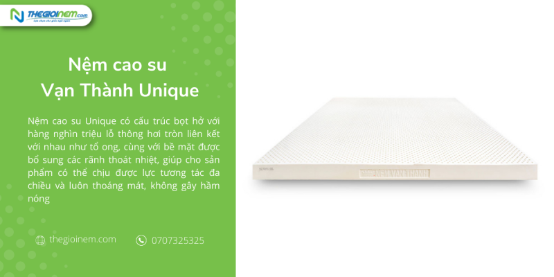 Nệm Vạn Thành dòng Unique có thiết kế 2 mặt lỗ tròn có thể sử dụng được cả 2 mặt. Nệm được làm từ cao su thiên nhiên, có những đặc tính nổi trội là đàn hồi cao và bền bỉ theo thời gian. Khả năng nâng đỡ đa vùng giúp nệm phân bổ trọng lực một cách hiệu quả ôm sát mọi đường cong từ đầu tới chân, mang đến cảm êm ái thư giãn cho người nằm. Độ thoáng mát vượt trội với cấu trúc bọt hở hàng ngàn lỗ thông hơi trên bề mặt nệm, không gây hầm nóng khi nằm.