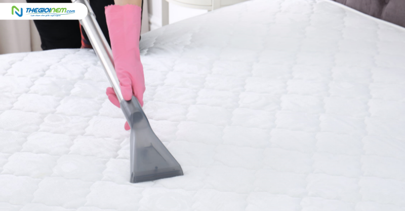 - Bước 2: Làm sạch bề mặt nệm bằng cách: sử dụng dịch vụ vệ sinh chăn, ga, gối, nệm bằng máy hút bụi để loại bỏ bụi bẩn, tóc rụng hay các mảnh vụn trên mặt nệm. Sử dụng máy hút bụi có đầu hút khe để hút các khe rãnh hay mép nệm.