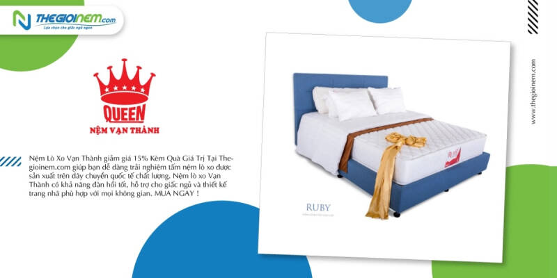 Nệm Vạn Thành thời gian gần đây tạo được ấn tượng mạnh trong lòng người tiêu dùng bằng chính những sản phẩm mới mẻ, có chất lượng cao. Với nhiều năm hình thành và phát triển, công ty Nệm Vạn Thành là một thương hiệu uy tín hàng đầu của ngành sản xuất nệm gối các loại và nội thất phòng ngủ, phục vụ trong và ngoài nước với tốc độ tăng trưởng tốt và bền vững. Sản phẩm chính của Nệm Vạn Thành gồm: Nệm - gối cao su thiên nhiên, nệm – giường lò xo các loại, nệm mousse, nệm gòn ép, nệm gấp đa tầng, chăn drap và các các sản phẩm chăm sóc sức khỏe giấc ngủ khác.